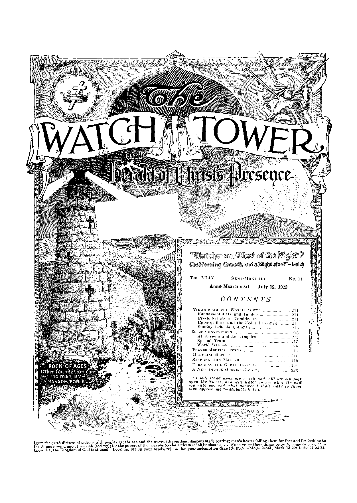 THIS journal is one of the prime factors or instruments in the system of Bible instruction, or “Seminary Extension”, now being presented in all parts of the civilized world by the Watch Tower Bible & Tract Society, chartered A. D. 1884, “For the Promotion of Christian Knowledge”. It not only serves as a class room where Bible students may meet in the study of the divine Word but also as a channel of communication through which they may be reached with announcements of the Society’s conventions and of the coming of its traveling representatives, styled “Pilgrims”, and refreshed with reports of its conventions.