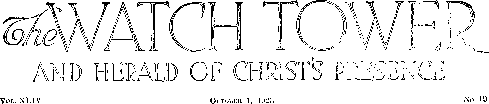 Editorial Committee: This journal is published under the supervision of an editorial committee, at least three of whom have read and approved as truth each and every article appearing in these columns. The names of the editorial committee are: J. F. Rutherford, W, E. Van Amburgh, J. Hemery, G. H. Fisher, R. H. Barber. Terms to the Lord’s Poor: All Bible students who, by reason of old age or other infirmity or adversity, are unable to pay for this journal, will be supplied free if they send a postal card each May stating their case and requesting such provision. We are not only willing, but anxious, that all such be on our list continually and in touch with the Berean studies.______________________