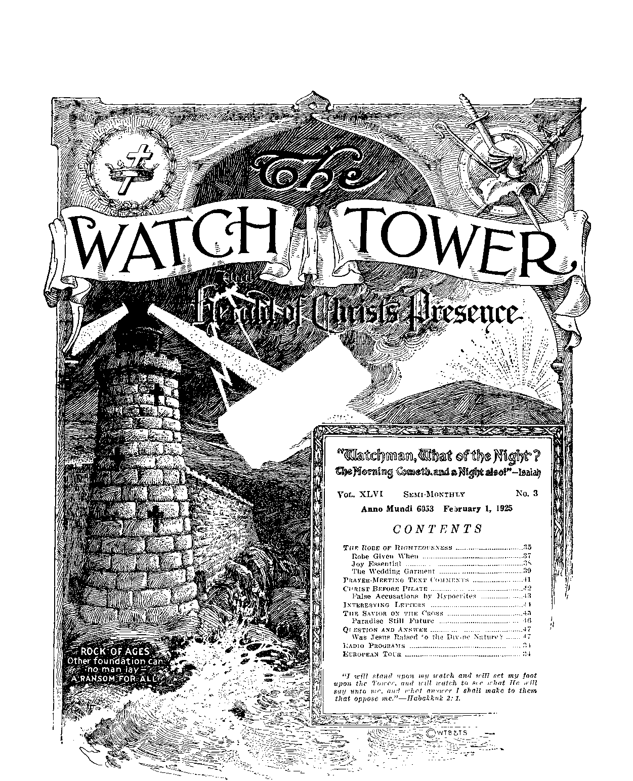 THIS Journal Is one of the prime factors or instruments in the system of Bible instruction, or “Seminary Extension”, now being presented in all parts of the civilized world by the Watch Tower Bible & Tract Society, chartered A. D. 1884, “For the Promotion of Christian Knowledge”. It not lonly serves as a class room where Bible students may meet in the study of the divine Word but also as a channel or communication through which they may be reached with announcements of the Society’s conventions and of the coming of its traveling representatives, styled “Pilgrims”, and refreshed with reports of its conventions.
