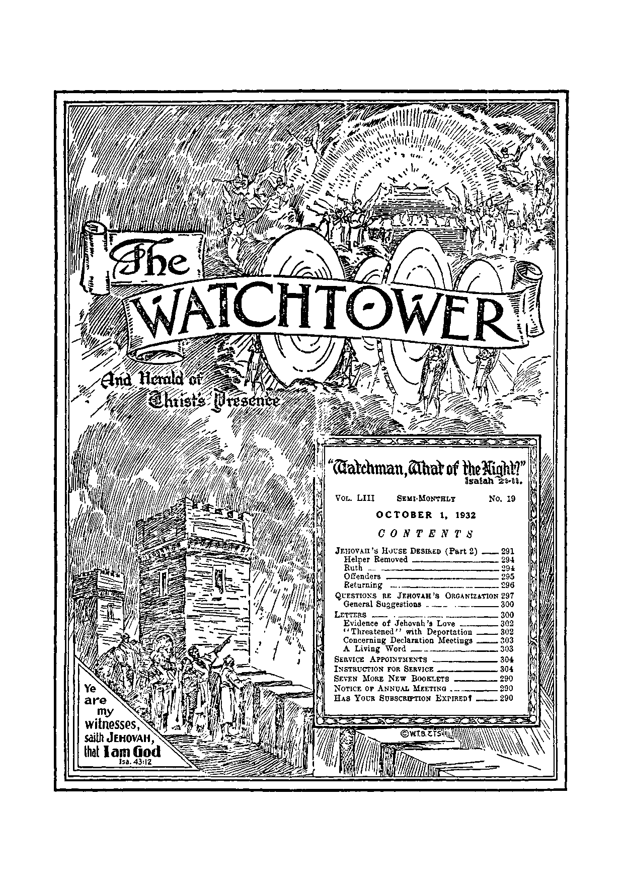 All sincere students of the Bible who by reason of Infirmity, poverty or adversity are unable to pay the subscription price may have The Watchtower free upon written application to the publishers, made once each year, stating the reason for so requesting it. We are glad to thus aid the needy, but the written application once each year is required by the postal regulations. Notice to Subscribers: Acknowledgment of a new or a renewal subscription will be sent only when requested. Change of address, when requested, may be expected to appear on address label within one month. A renewal blank (carrying notice of expiration) will be sent with the journal one month before the subscription expires. Entered as Second Class Hail Hatter at Brooklyn, N. Y., Postoffice.