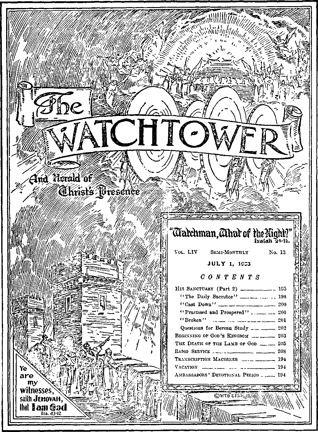 It adheres strictly to the Bible as authority for its utterances. It is entirely free and separate from all parties, sects or other worldly organizations. It is wholly and without reservation for the kingdom of Jehovah God under Christ his Beloved King. It is not dogmatic, but invites careful and critical examination of its contents in the light of the Scriptures. It does not indulge in controversy, and its columns are not open to personalities.