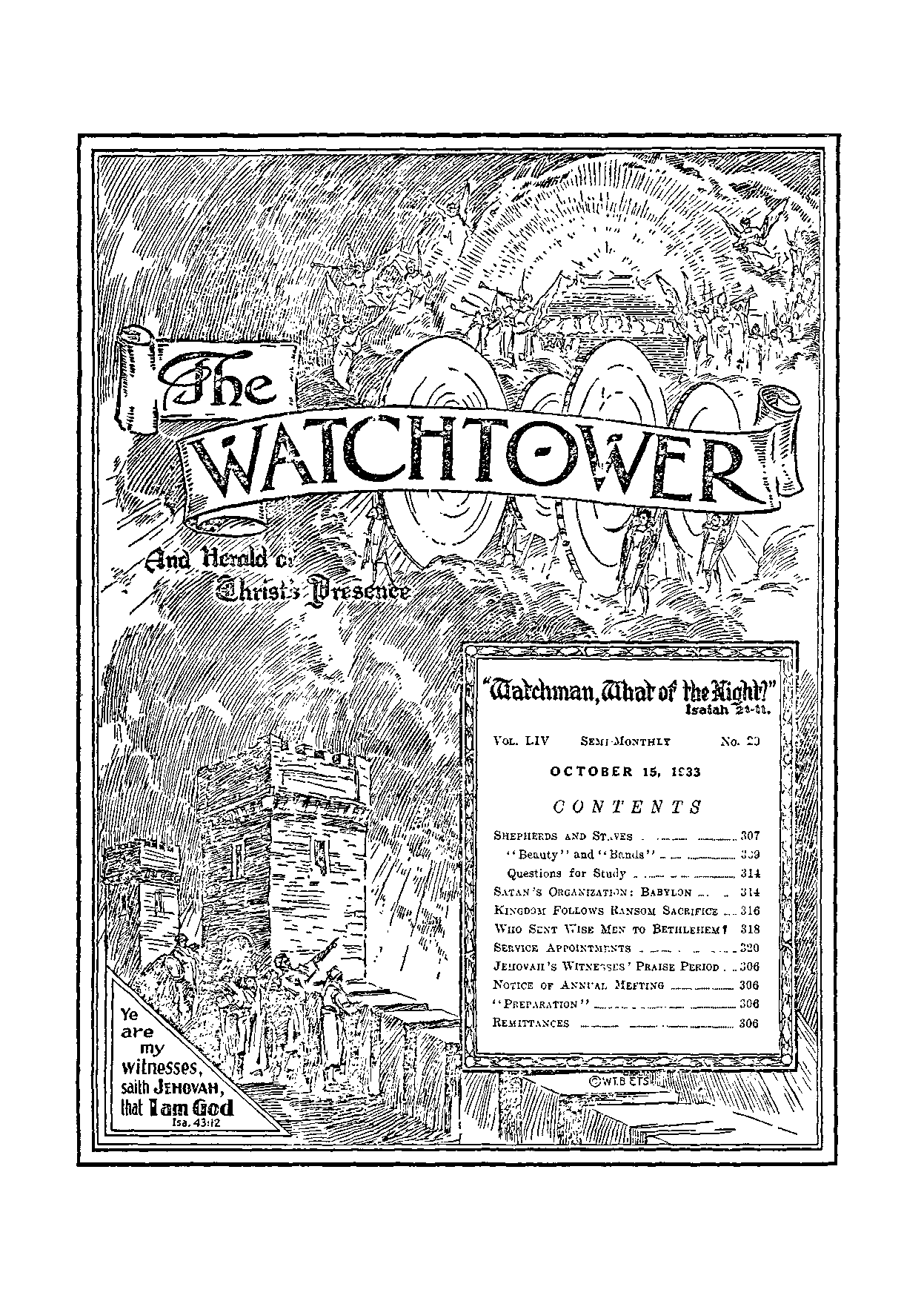 It adheres strictly to the Bible as authority for its utterances. It is entirely free and separate from all parties, sects or other worldly organizations. It is wholly and without reservation for the kingdom of Jehovah God under Christ his Beloved King. It is not dogmatic, but invites careful and critical examination of its contents in the light of the Scriptures. It does not indulge in controversy, and its columns are not open to personalities.