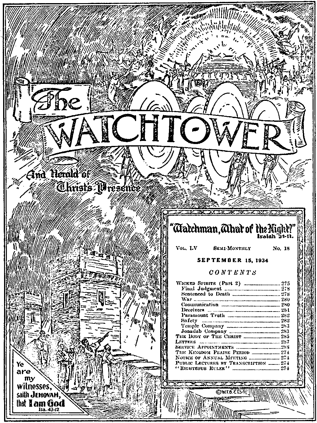 22 The conflict or war in which Jehovah’s witnesses engage is not with human creatures, that is to say, with flesh and blood. We once were led to believe that this was their fight, and that they must develop a perfect character in order to get to heaven. But that is not their real fight. In recent years The Watchtower has time and again declared that we have no fight with men. Our fight is with Satan and a host of wicked spirits operating with him, which unseen wicked hosts use men as their dupes or agents, who are on earth and who willingly or unwillingly do the bidding of the unseen wicked powers. We have now come to the “last days”, that is to say, the days just preceding Armageddon, in which, as in the days of Noah, the earth is filled with wickedness by reason of the operation of Satan and his wicked allies. (2 Tim. 3:1-6) The great Spirit, Jehovah God, by and through his faithful servant Paul gave warning to.the followers of Christ Jesus who arc witnesses for Jehovah in these day;;, and who are therefore on the side of Jehovah, and the special objects of the enemy’s assault: “Finally, strengthen yourselves in the Lord, and in his mighty power. Put on the complete armor of God, that you may be able to stand against the crafty ways of the enemy.” (Eph. 6:10, 11, l)ia</.) What enemies? Satan and his host, his wicked spirits, that have operated with him since the time of the rebellion, and concerning which wicked hosts the apostle says: “Because our conflict is not with blood and flesh, but with the governments, with the authorities, with the potentates of this darkness, with the spiritual things of wickedness in the heavenlies.” (Eph. 6:12, Diag.) Why is that wicked crowd making war on Jehovah's witnesses? Because such witnesses are in God’s organization and engage in his service of delivering the message of truth, which Satan and his crowd do not want the people to hear, and because the truth pronounces the doom of Satan and his organization.