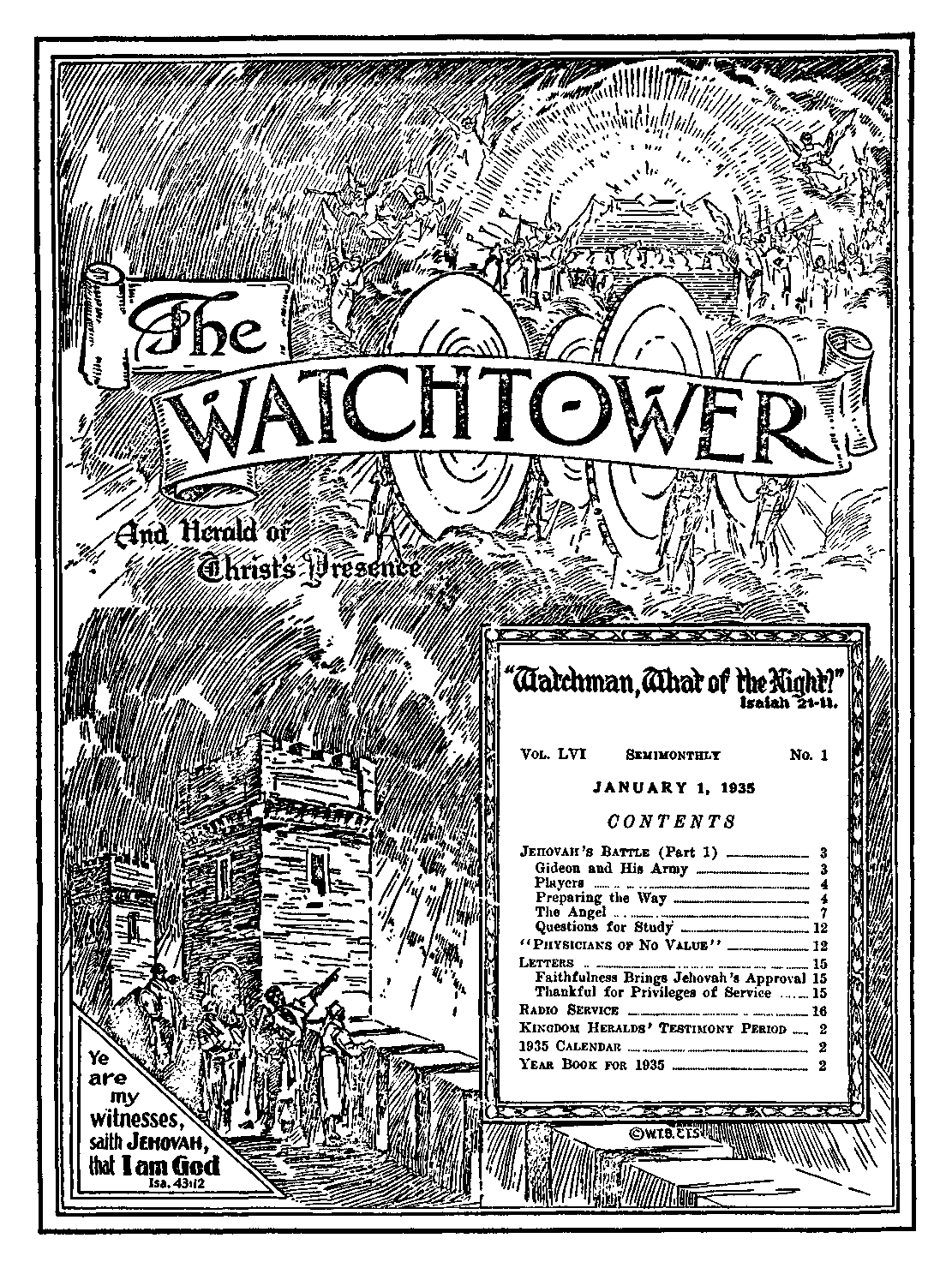 The prophet Ezekiel regularly measured the waters flowing out from the temple. The Society does likewise, and here announces the issue of the Year Book for 1935. This contains the president’s annual report, describing the purposes of the Society and briefly but comprehensively reviewing the activities, the experiences and the work accomplished during the service year just past by Jehovah’s witnesses and Jonadab brethren in the various countlies where the Lord has placed them. Also the 1935 year text, with appropriate comment, is given, and daily texts and comments for your refreshment and instruction each day of the year. Only a limited edition is being printed; hence the Year Book is offered at 50c a copy. Remittance to cover should accompany order, forwarded to the Brooklyn office or branch office. Groups of Jehovah’s witnesses and Jonadabs should combine orders and send through local service director or sharpshooter.