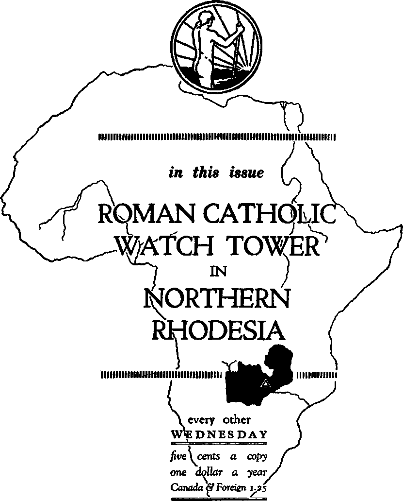 Rutherford; thence to Brooklyn, N. Y., by air mail (all in 30 days) comes the last-minute news that the ordinance banning Judge Rutherford’s books in Northern Rhodesia became law before the Copper Belt riots took place, which is proof conclusive not only of the innocence of Jehovah’s witnesses of any connection whatever with those disturbances, but gravely implicates the Northern Rhodesia Government itself with guilty connection with the whole affair. Is that government taking orders from the Roman Catholic Hierarchy’s “white fathers”? Those clergymen serve the savage Awembas of Northern Rhodesia. They teach those natives to worship and serve men and images of men and women, and to ignore the written commands of Almighty God in His Book. The Bible is kept away from the natives by the “white fathers”. Let sober-minded Britishers everywhere judge whether or not Jehovah’s witnesses shall be prevented from helping the natives and others in British colonial Africa to understand THE BIBLE.