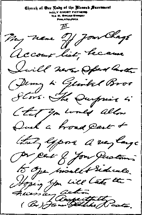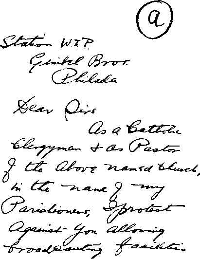 XV. The aforesaid letter was duly mailed or forwarded to and received by said Station WIP and by Gimbel Bros., who own or control the said broadcasting station and are heavily interested in it financially, and who also own and operate one of the most extensive department stores in the said City, of which the said defendant Clarke was, as alleged in said letter, a customer with a credit account, and also as alleged a very large percentage of its customers were Roman Catholic parishioners and adherents and also auditors of the radio broadcast addresses of this plaintiff, as in said letter indicated.