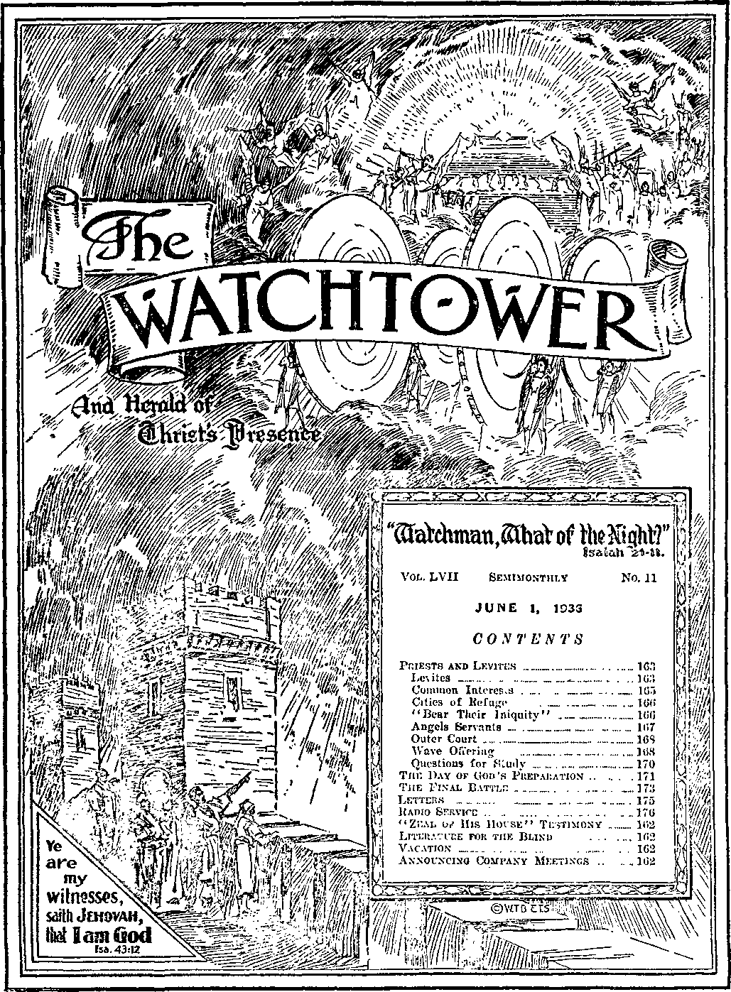 50 It is reported from time to time that there are controversies among some of the companies of God’s professed people now on earth. Such is conclusive evidence that those who indulge in such controversies or strife for personal advantage arc not in fact, in the temple but are associating themselves with those who arc in the temple. Those who are devoted to God and to his kingdom should refrain from unnecessary discussions with opposers and avoid those who seek to cause divisions. (Rom. 16: 17, 18) The proper attitude of those who have come into the hoiwe of the Lord is expressed by the psalmist. (Ps. 122:1-9) All the faithful ones, priests and Levites, are standing approved in the congregation of the Lord, bearing on their foreheads the name of Jehovah, and together are singing the new song. There must be complete harmony among all of those who arc w’holly •levoted to Jehovah and in harmony with Jehovah and Christ Jems, the Higher Powers of the entire organization. Satan’s organization consists of all those who are against God and his kingdom, and Satan and Gog are the higher powers of that wicked organization. The Lord has his representatives on the earth who serve in his organization under the direction of Christ Jesus, the great High Priest. Some of these are pictured by the underpriests, and others are pictured by the others of the tribe of Levi. All are Leviti-s, but not all occupy the same place in the earthly part of God’s organization. It is written, in 1 Corinthians 12: IS: ‘‘But now hath God set the members every one of them in the body, as it hath pleased him.” There are no bosses in God’s earthly organization, and if anyone arbitrarily assumes to boss he is almost certain to be removed by the Lord. That docs not mean, however, that no one on eaith shall transmit the instructions of God's organization to others. We must know that the Lord is conducting his organization according to his perfect wisdom and he has his own good way of directing his work. If each and every one of the followers of Christ on earth should follow' his own course in the performance of service, tlieie would be nothing else than confusion, and that could not be according to the will of God: ‘‘For God is not the author of confusion, but of peace, as in all churches of the saints.” (1 Cor. 14:33) There must be peace and order, and it is certain that the Lord is directing his organization and service and using those on earth according to his will. The Watch Tower Bible & Tract Society, the corporation, was organized to comply with the laws of the land that arc not contrary to God's law. The corporation and its proper operation enables God's people to render unto Caesar the things that are Caesar’s, or which the law of the land properly requires. The ‘‘Society”, as that term is generally used, consists of all of the anointed ones on earth who continue faithfully doing the Lord’s service and who engage in the orderly procedure of service. Such anointed ones, by the Lord's grace, working in a body, are enabled to render unto Jehovah the things that are God’s. The chief concern of each one is and should be to do with his might the thing to which he is assigned and to do it always as unto the Lord. “"Whether therefore ye cat or drink, or whatsoever ye do. do all to the glory of God ” (1 Cor. 10:31) Doing the Lord's service in this manner, the anomted are now fulfilling in antitype that which was performed by the entire tribe of Levi in type. Those who are wholly devoted to Jehovah will not be disposed to engage in controversy, discussions and haggling as to whether or not someone in the organization is ri reiving mote or less honor than they are receiving. It is God thimigli Christ Jesus that is conducting his work, and his servant is responsible to the Loan, and the Lord will determine whether or not that person is properly rendering service. (Rom. 14:4) What differem-e does it make where one serves in the Lord’s organization? The question that should more deeply concern each one is, Am I faitiifnlly performing the service to which I am assumed, and am I loyally and faithfully maintaining my integrity toward Jehovah I The vindication of his name is the great question for final settlement. Faithfulness on the part of each servant is required, and only those who are loyal and faithful will participate in the vindication of Jehovah’s name. All the antitypieal Levites on the earth will be singing: “I was glad when they said unto me, Let us into the house of the Lord. Our feet shall stand within Ii;y gates, O Jerusalem. Jerusalem is buikled as a city that is compact together: whither the tribes go up, the tribes of the Lord, unto the testimony' of lsra< 1, to give thanks unto the name of the land. For tin ie are set thrones of judgment, the thrones of the house of David. Pray for the peace of Jerusalem : they shall prosper that love thee. Peace be within thy walls, and prosperity within thy palaces. For my brethren and companions’ sakes, I will now say, Peace be within thee. Because of the house of the Lord our God 1 will seek thy good.”—Psalm 122.