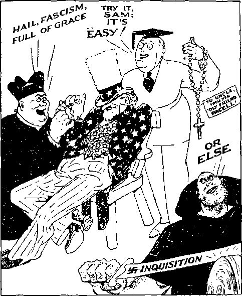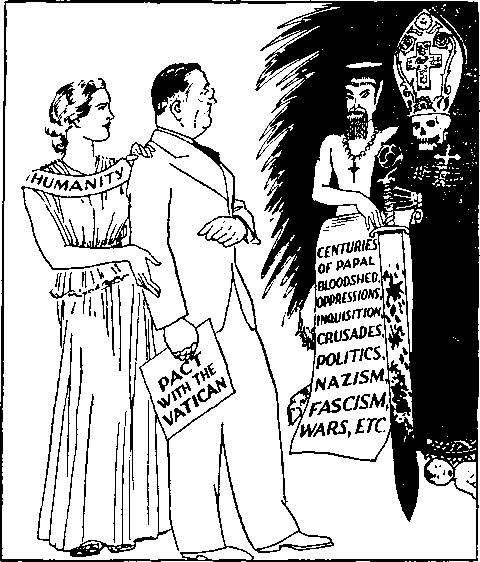 Other men would like to be the Supreme Court, each of the country where he rules, or seeks to rule as dictator: Oswald Mosley in Great Britain, Leon Degrelle in Belgium, Francois de la Rocque in France, Francisco Franco in Spain, Franklin Delano Roosevelt in the United States of America. All of these men are either Roman Catholics or are of Roman Catholic leanings. Three of Mr. Roosevelt’s sons have had private interviews with the pope within the past year or so.