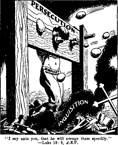Now this religious and political copartnership of Monessen comes to you with a request to enact a law which will enable them to throw Jehovah’s witnesses into jail and keep them there for sixty days at a stretch. It is the priests of Monessen, with their righthand associate, Mayor James C. Gold, that are sponsoring Bill No. 164. It is not designed to protect religious groups. On the contrary, it is designed to give a bunch of priest-led politicians the opportunity to throw their critics into jail. It is aimed primarily at Jehovah’s witnesses. It might just as well have the name Jehovah’s witnesses blazoned across the front of it. It will be used not only against Jehovah’s witnesses, but against all who interfere with the program of the Roman Catholic Hierarchy to control and operate all things in its own behalf. If this measure becomes a law there will be no more free communication of thoughts and opinions. There will be no more free speaking and writing on all subjects. Freedom of conscience will be kicked into a condition of innocuous desuetude, and dictatorial, intolerant methods will prevail. Any newspaper that criticizes a preacher’s sermon would do well to count the cost before going to press. Any bookdealer must needs examine the contents of his wares closely before putting them on sale. For instance, he would have to eliminate some of the writings of the beloved Mark Twain from his stock. Any librarian would of necessity have to remove some of Shakespeare’s works from the shelf in order to protect herself from a hundred-dollar fine and a sixtyday jail sentence. And what a wholesale gathering-in there could be of newsboys, news agents and newspaper publishers who publish the facts concerning the part the Roman Catholic Hierarchy now plays in the affairs of Spain, Germany, and other European countries.