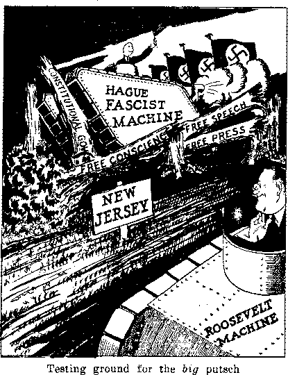 ♦ In stainless Jersey City*, which is so holy, under the rule of Frank Hague, that even the gospel is obnoxious, and men and women are thrown into prison on even the bare suspicion that they may wish to preach it, Scott E. Leslie, a New York handwriting expert testified that thirty-two of the ballots east on September 21 in a single district of the Second Ward were written by a single person. Twenty-eight other ballots were in the handwriting of only four other persons.