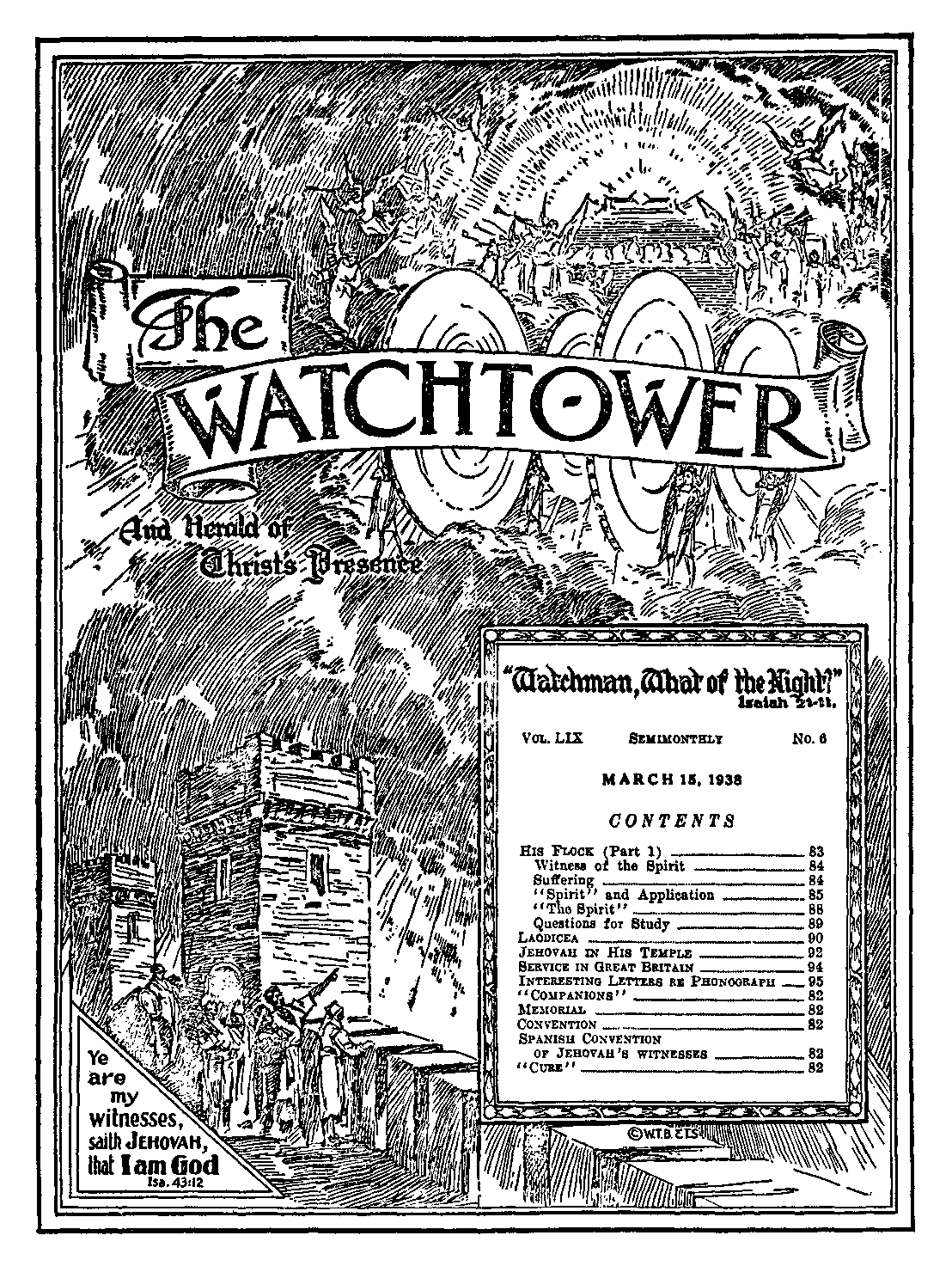 40 It would not follow that everyone who makes a consecration and is spirit-begotten before the coming of the Lord to the temple would have the witness of the spirit, but those who have been invited to share with Christ Jesus in the kingdom and who have responded to that invitation. To such the spirit bears witness that they are the sons of God, heirs of God and jointheirs with Christ Jesus in his kingdom. At the coming of the Lord Jesus to the temple and the gathering unto himself at the temple of those who have responded to the invitation for the kingdom, and who upon examination have been found approved and been brought into the temple, such occupy an intimate relationship to the Lqrd Jesus Christ. No longer is it accessary for the advocate, the holy spirit, to testify to them, but the Lord Jesus himself is their strength a:id guide, because he is with them. Those gathered into the temple are made a part of the ‘elect servant of God’, and the angels of the Lord Jesus Christ that serve him at the temple minister unto the temple company: “And he shall send his angels with a great sound of a trumpet; and they shall gather together his elect from the four winds, from one end of heaven to the other.” (Matt. 24:31) “For he shall give his angels charge over thee, to keep thee in all thy ways.” (Ps. 91:11,12) It is only the “little flock” that is gathered to the temple, and it is such “little flock” to whom ‘the spirit beareth witness’ that such are the sons of God. When did this witness of the spirit begin ? and how is it given by which one may determine his call and selection to the kingdom with Christ Jesus?
