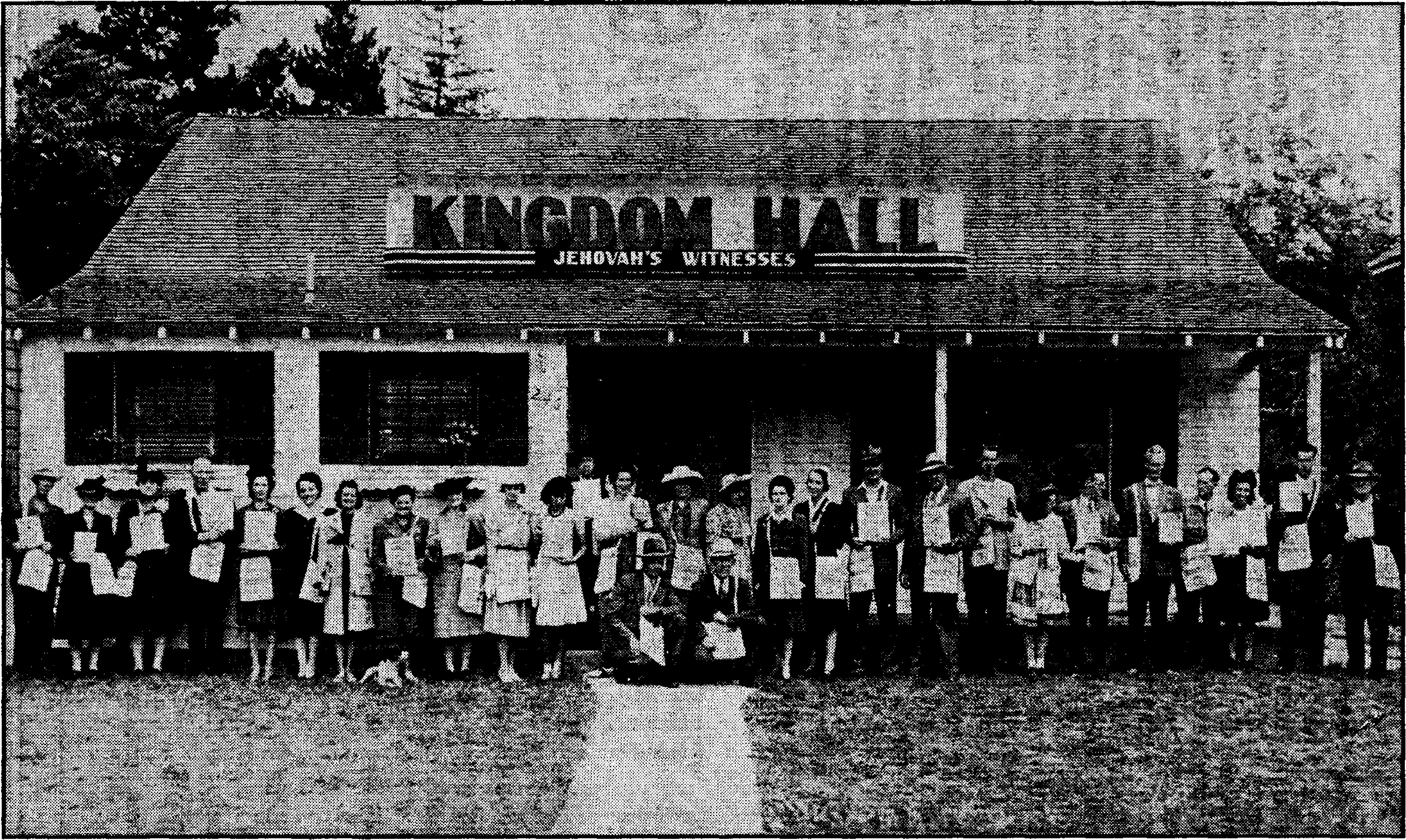 Herewith a picture of the attractive Kingdom Hall of Jehovah’s witnesses at Willow Glen, Calif. Friends of Willow Glen and San Jose are assembled for their regular Saturday afternoon street-witnessing activity. Assembling together before going out to their assigned places on the streets has served as an added stimulus to the witnessing activity, making for a feeling of close co-operation in this important branch of publishing “this gospel of the Kingdom”. All the publishers appear on the streets at the same time. Placements of The Watchtower and Consolation were increased by this method.