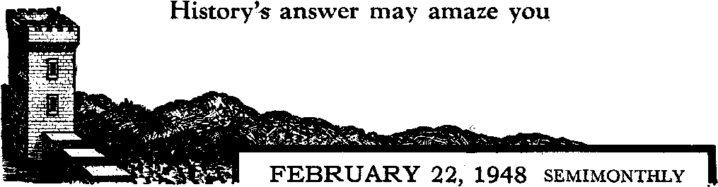 * “Strange As It Seems,” edited by John Hix, says that in the last 3,434 years there have been 8,000 peace treaties signed but only 268 years of peace, which is enough to make the present puny peace-makers quiver and the people in general to tremble. “We have won the war,” murmurs Senator Taft, “but we have lost the peace.” Fearful that the United Nations will also fail, a group of frightened men are heard to cry for a “World Federal Government”. Albert Einstein, one of the sponsors, says that “everything has to be done to make it clear to the electorate that the solution can only be world government and nothing less”. “The very existence of mankind” is at stake, he says. Henry Chamberlin, in his book The European Cockpit, says that over there “a federated Europe”- is the only answer. Yugoslavia’s ambassador to the United States, Kosa-novic, thinks that peace will come when there is an agreement between the Soviet and the United States. Others, fearful that there will never be “one world”, work for a division into two worlds. On the one hand the “Truman doctrine”, the “Marshall plan” and the “little assembly” are put forth by the Western world as ways of obtaining peace, while Russia at the same time solidifies eastern Europe and revives the “comintern”, or . “cominform’’, as some call it, as her means of unifying the nations. And so it goes, every frightened mariner aboard the world’s sinking ship on this stormy sea suggests a different course to sail in hopes of reaching the same port of peace.