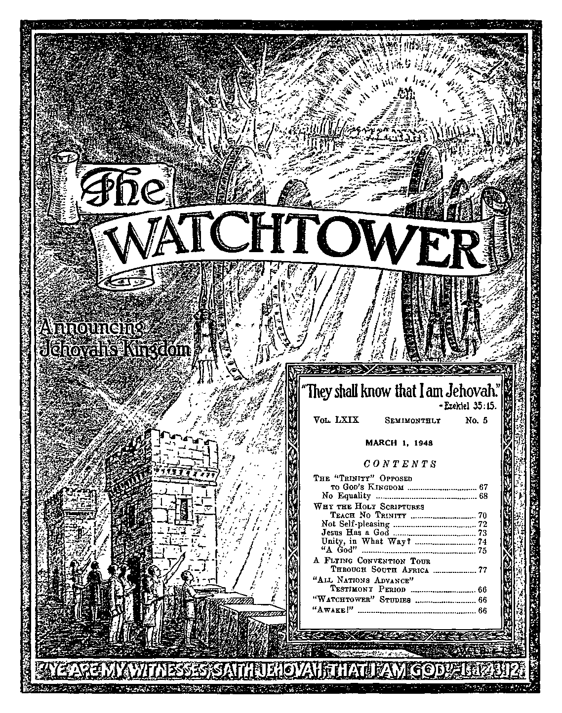Week of April 18: “Why the Holy Scriptures Teach No Trinity," fl 16-29 inclusive, The Watchtower March 1, 1948.