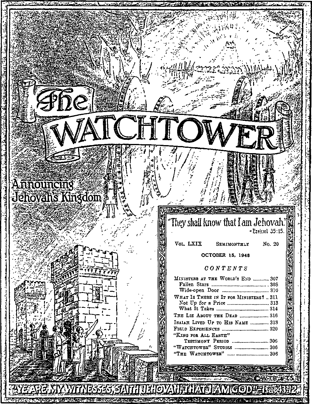 Week of November 21: “Ministers at the World’s End,” fl 1-19 inclusive, The Watchtower October 15, 1948.