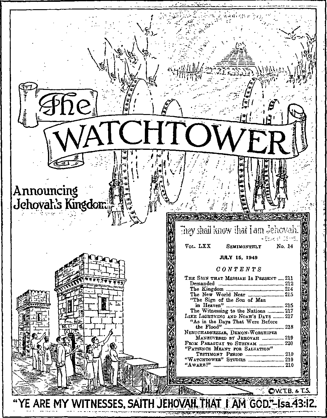 Week of September 4: “The Sign that Messiah Is Present,” fl 20-32 inclusive, also “I.ike Lightning and Noah’s Days,” fl 1-11 inclusive, The Watchtower July 15, 1949.