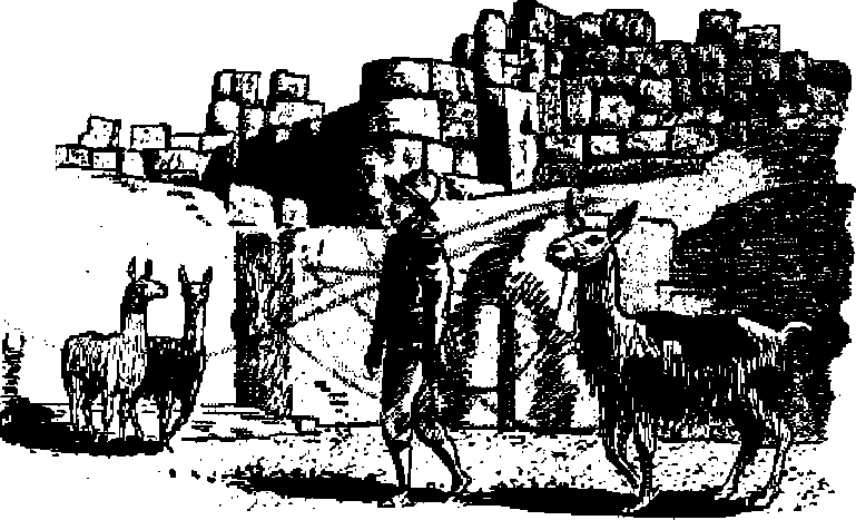 Peculiar to Inca-land are the herds of llamas, quaint animals very aptly described by one writer as “miniature, incorrectly-designed camels”. They seem to be disdainful of everything in general and nothing in particular. Natives contend that llamas will stubbornly refuse to accept a load of more than fifty kilos, or 113 pounds, and if forced to do so, they sit down or spit at their would-be oppressors. They are very profitable animals, not only for their wool and burden-bearing capacity, but also because they eat so little and can go as long as five days without water. Their droppings are used for fuel, firewood being very expensive. One should not speak disparagingly of so worthy a creature.