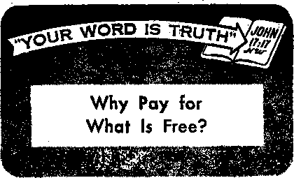 "Emphasis on Christian tithing is rapidly developing as a main theme in the churches of the National Council of Churches of Christ in the U.S-A.,” said “Rev.’.’ T. K. Thompson, executive director of the stewardship department. “Millions of Americans are coming to realize,” said he, "that giving generously to the church is a part of a Christian’s response to God’s call on his life.” This religious leader stated that tithing will be promoted in the council's denominations through movies, literature, sermons and speeches. Tithing is proclaimed as "a good business proposition,” as going “into business with God,” as “the great business of life,” as “an act of worship,” as “a supreme act of worship," and it is claimed that, “if every Christian would tithe, the entire world could be evangelized and peace would be secure.” But nowhere can Scriptural support be mustered to the aid of such extravagant claims.