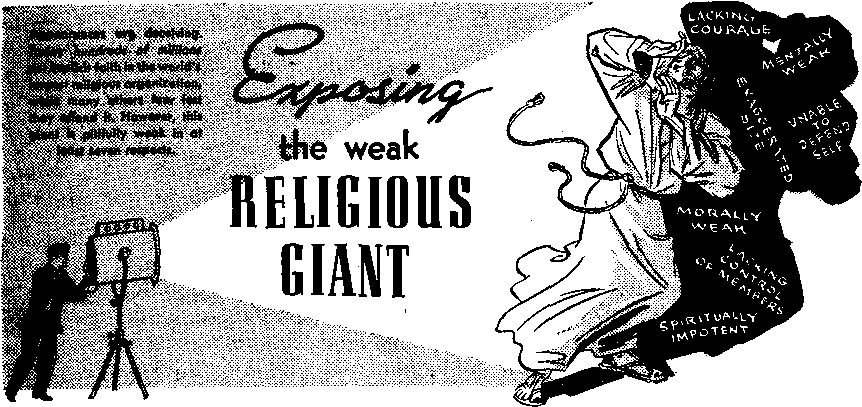A further proof of the inability of this giant to protect himself is his resorting to such foul means as murder, mob action and boycott, even as a boxer would rain foul blows upon his opponent if lacking in skill or strength. Yes, by resorting to any and all such tactics this religious giant is cravenly admitting his weakness: the weakness of being unable to combat ideas with ideas, logic with logic and Scripture with Scripture. Early Christians used only the “sword of the spirit,” God’s Word; no carnal weapons.