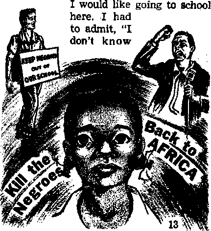 • How it feels to walk through a howling mob into an integrated School? P. 13, US.