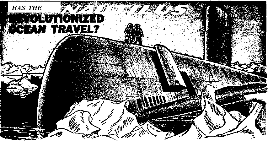Although they are at present too costly to operate commercially, the first atomic submarine, the Nautilus, may well have a revolutionizing effect on ocean travel. She has demonstrated the immense possibilities a submarine has for peaceful service to mankind.