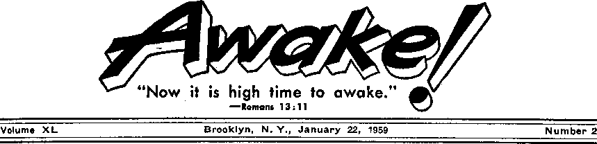 Newi sources that are able to keep you awake to the vital issues of our times must be unfettered by censorship and selfish interests. "Awake!" has no letters. It recognizes facts, faces facts, is free to publish facts. It is not bound by political ambitions or obligations,- it is unhampered by advertisers whose toes must not be trodden on,- it is unprejudiced by traditional creeds. This journal keeps Itself free that it may speak freely to you. But It does hot abuse its freedom. It maintains integrity to truth.