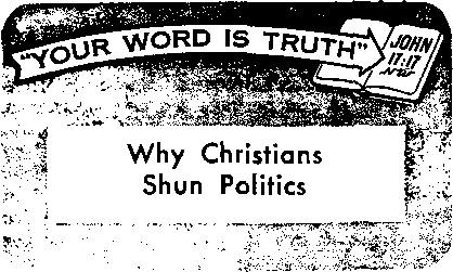 Is politics, then, a duty and responsibility of Christians? Hardly. Christians must shun politics and all worldliness. The everlasting kingdom of God is the government that receives their wholehearted support and vote.