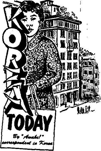 Perhaps the biggest difference in the city is transportation. Streetcar service has been increased and extended. Buses are available for every part of the city and suburbs. These buses are made of locally fashioned bodies mounted on former military truck chassis. In Seoul, Pusan, Taegu and a few other cities a familiar sight has become the Hapsung or group-taxi, which follows a prescribed route. These small vehicles are patterned after the American Willys Station Wagon, but are a bit smaller. It is not unusual to see thirteen persons jammed into these taxis. A passenger may go anywhere along the route for twenty cents. One company making these vehicles did not see why it could not go its American counterpart one better, so on all its vehicles one can see a large easy-to-see chrome-plated casting mounted on the hood reading, "6-Wheel Drive.” These Hapsung taxis have done as much as anything to make life more convenient in the capital city. During the* rush hours all forms of travel are crowded to the limit