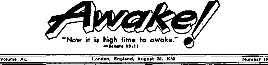 News sources that are able to keep you awake to the vital Issues of our times must be unfettered by censorship and selfish interests. “Awake!" has no fetters. It recognizes facts, faces facts, is free to publish facts. It Is not bound by political ambitions or obligations; it is unhampered by advertisers whose toes must not be trodden on; it is unprejudiced by traditional creeds. This journal keeps Itself free that it may speak freely to you. But It does not abuse its freedom. It maintains integrity to truth.