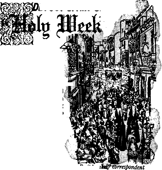 In the tiny Aragonian town of Hijar no one goes to bed for two nights, it is said. As the clock strikes twelve midnight of Holy Thursday, all the townspeople begin to beat vigorously on tambourine-like drums, and this constant din never ceases until Saturday. The very religious city of Seville organized fifty-two processions this year, and from 2 a.m. on Holy Thursday until the close of Holy Friday at midnight, there was never a moment when a procession was not inching its way through the maze of crooked streets of that city. Since the cost of a procession is about' $1,400, smaller towns usually have*to be content with just one procession, that of the image of the “Anguished One,” the Virgin Mary.