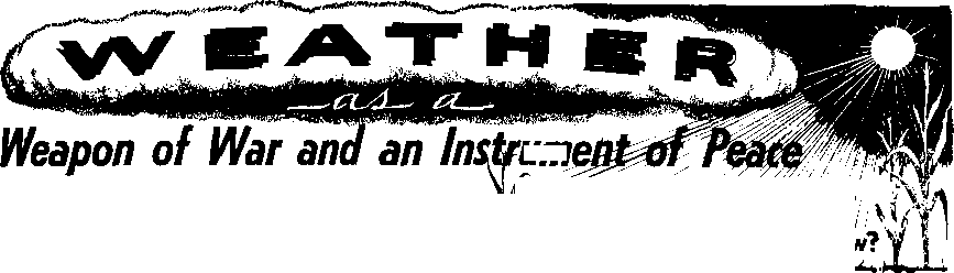 WEATHER control looms on the horizon as a greater threat to humankind than the hydrogen bomb. Leading climatologist Dr. Hans W. Ahlmann says for that reason that he hopes “man never learns to control the climate of the world.’’ There are far too many opinions and ideas about climate control, he says. “Look at the difference between the ideas of the tourists and the farmer on rain.’’ In fact, already men are warned against “rain stealing.” Some states in America have passed laws claiming ownership of the water in all clouds within their borders to protect themselves from rain thievery. Others warn of weather warfare.