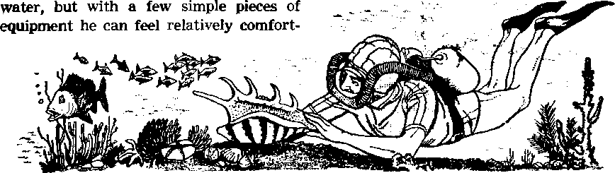 ACH new summer sees thousands of initiates donning the mask, “snorkel" and “fins’* for a journey into the underwater world. From the frigid north, where enthusiasts may have to chop a hole in the ice, to the tropics, where the water may be too hot for comfort, they plunge into this strange and fascinating world where their bodies become almost weightless, where they instantly become “free as a bird*’ and where they are able to move in any direction—up, down, or around— with a kick of a fin. For the most part, this is a silent world. No Screeching brakes, no doors slamming, no people talking down here, but a world where creatures move and glide about apparently without sound. There are exceptions, of course, and you quickly learn to recognize a few, such as the whir of a passing motorboat or the clicking of a snapping shrimp tucked somewhere in a coral reef. But the exceptions to the stillness of this silent world are few. This and the wonder of discovery are drawing many to skin diving,
