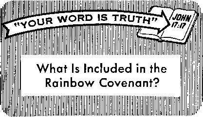 What about this rainbow covenant? Is it a bilateral or a unilateral covenant? For long it was thought to contain certain conditions that man had to meet, those mentioned at Genesis 9:1-7, but not so. A more careful examination of the record reveals that the mandate mentioned at Genesis 9: 1-7 is separate and distinct from God’s rainbow covenant promise. That mandate was merely a restatement of the mandate that God gave to Adam and Eve, because now the human race was starting out anew, as it were. Of course, there were certain changes, because conditions had changed. Thus in the place of the threefold mandate mentioned at Genesis 1:28, a new mandate was given: “Be fruitful and become many and fill the earth. . . . Every moving animal that is alive may serve as food for you. . . . Only fiesh with its soul—its blood—you must not eat. . . . Anyone shedding man’s blood, by man will his own blood be shed.” And then, as if to round out this mandate, Jehovah repeated' the first command: “Be fruitful and become many, make the earth swarm with you and become many in it.” Note that nothing is here said about a covenant, but, of course, the penalty for wanton bloodshed is made clear.