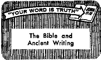 Slightly earlier must be dated the references to writing found in the Bible boot of Job and which show that writing was taken for granted at that time: “O that now my words were written down! O that in a book they were even inscribed! With an iron stylus and with lead, forever in the rock O that they were hewn!” “O that I had someone listening to me, that according to my signature the Almighty himself would answer me! Or that the individual in the case at law with'me had written a document itself! Surely upon my shoulder I would carry it; I would bind it around me like a grand crown.”—Job 19:23, 24; 31: 35, 36.