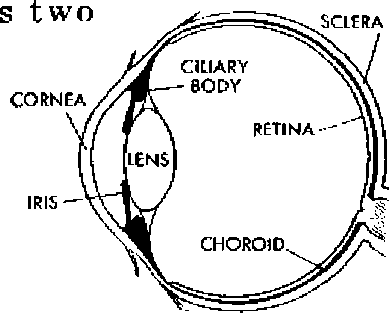 Joined to the iris on each side is a ciliary body. Each has a muscle that adjusts the lens for near or distant focusing, and it also has some seventy folds. Then, joined to the ciliary bodies on each side is the choroid, meaning skinlike. It completes the second coat, accounts for two-thirds of it and abounds in blood vessels.