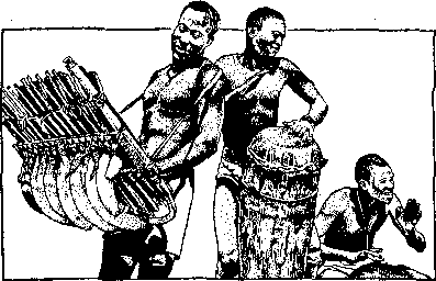 Some of the unusual ones are the horns made of seashells, the wooden talking drums of Africa, the forked harp with a calabash attached to serve as sounding chamber, and the balaphon, an African-style xylophone with rows of little calabashes of various sizes underneath to give the tones.