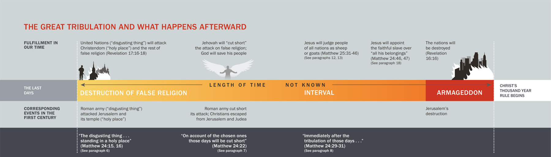 5 For example, the great tribulation did not begin in 1914. How do we know this? Because the Bible’s prophecies show that the great tribulation will begin with an attack on false religion. It will not begin with a war among nations. So the war that began in 1914 was not the beginning of the great tribulation. It was the “beginning of pangs of distress.” (Matthew 24:8) These “pangs of distress” were similar to what happened in Jerusalem and the district of Judea from the year 33 to the year 66.