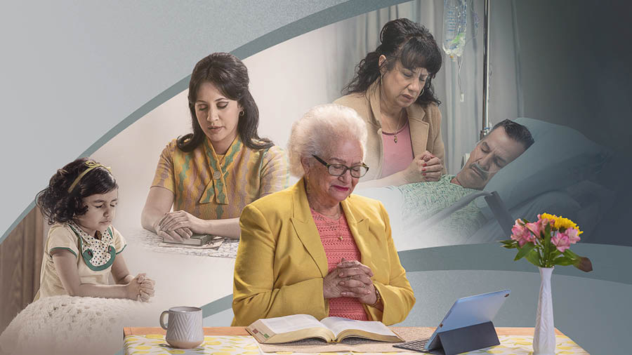 PICTURE DESCRIPTION: From childhood on, a sister has been regularly praying to Jehovah. When she was little, her parents taught her how to pray. As a teenager, she began serving as a pioneer and often asked Jehovah to bless her ministry. Years later, when her husband became very ill, she supplicated Jehovah for the strength needed to endure this trial. Today, as a widow, she perseveres in prayer, confident that her heavenly Father will answer her prayers—just as he has done throughout her life.