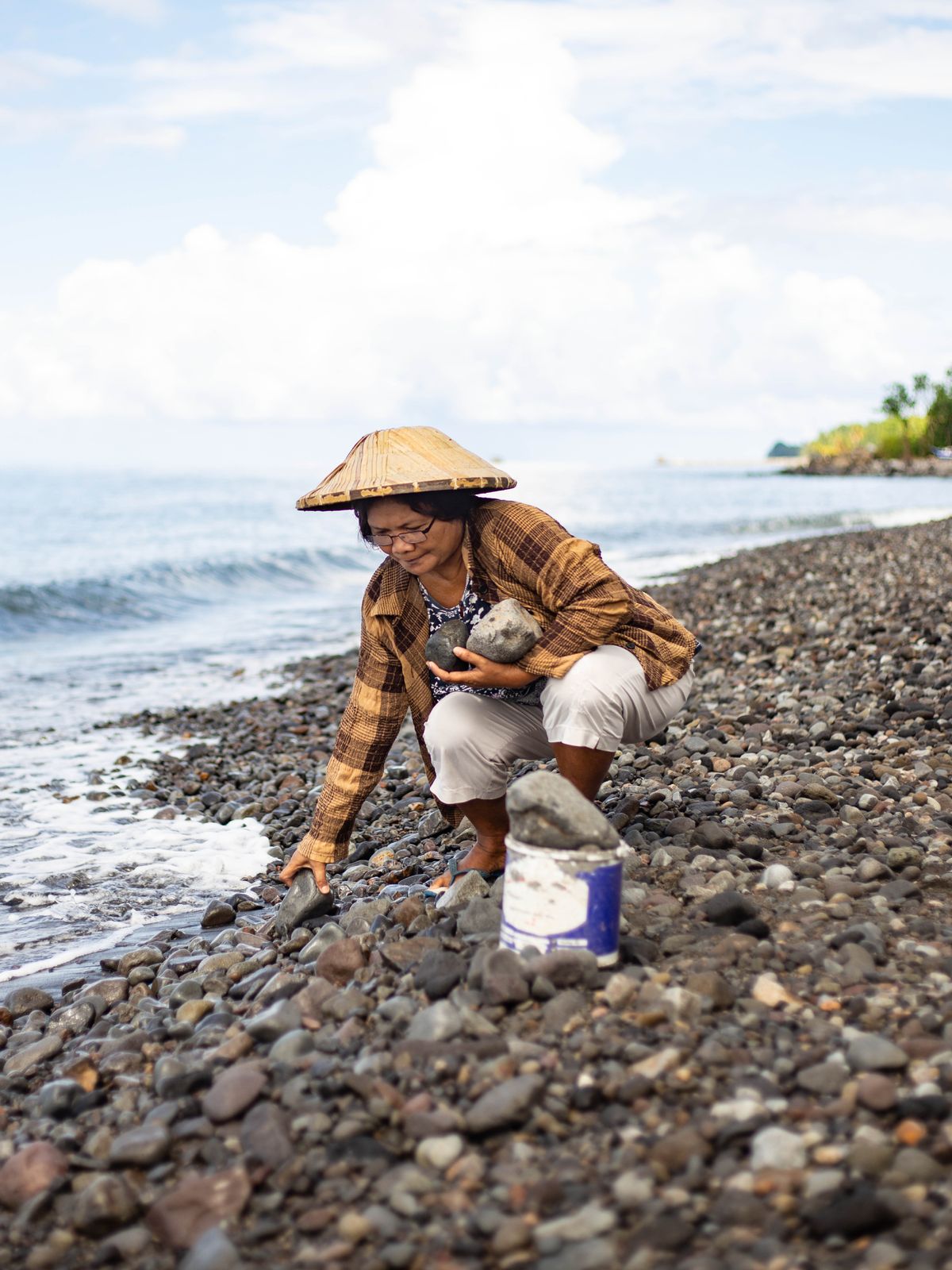 Hulda, gathering stones on the beach