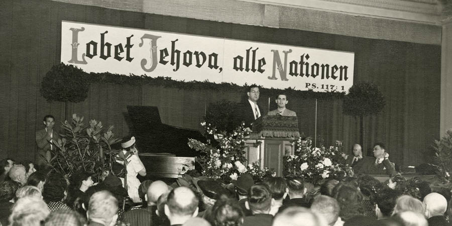 Nathan H. Knorr addressing brothers in Wiesbaden, Germany, in 1947. Above him is the yeartext in German: “Praise Jehovah, All Nations”