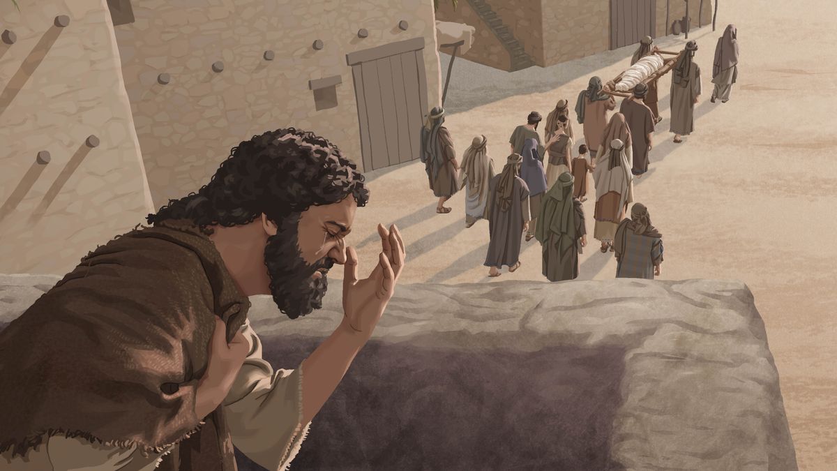 e PICTURE DESCRIPTION: From a rooftop, a Nazirite watches the funeral procession of a beloved family member. His vow prevents him from taking part at close range.