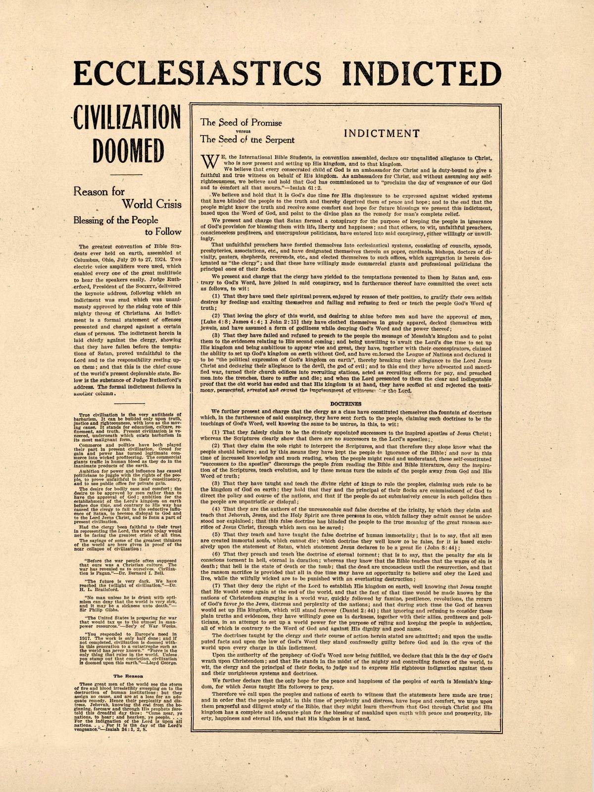 Another highlight of the convention came on Friday, July 25, when Brother Rutherford read an indictment, a bold proclamation against the clergy. In the style of a legal document, the indictment charged political, religious, and commercial leaders with “keeping the peoples in ignorance of God’s provisions for blessing them with life.” Additionally, the indictment noted that these men had “endorsed the League of Nations and declared it to be ‘the political expression of God’s kingdom on earth.’” The Bible Students would need bold persistence to take this message to the people.
