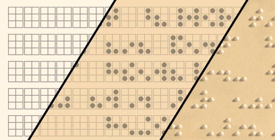 Groups of one to six raised dots represent characters. The raised dots are arranged in a six-position cell or matrix