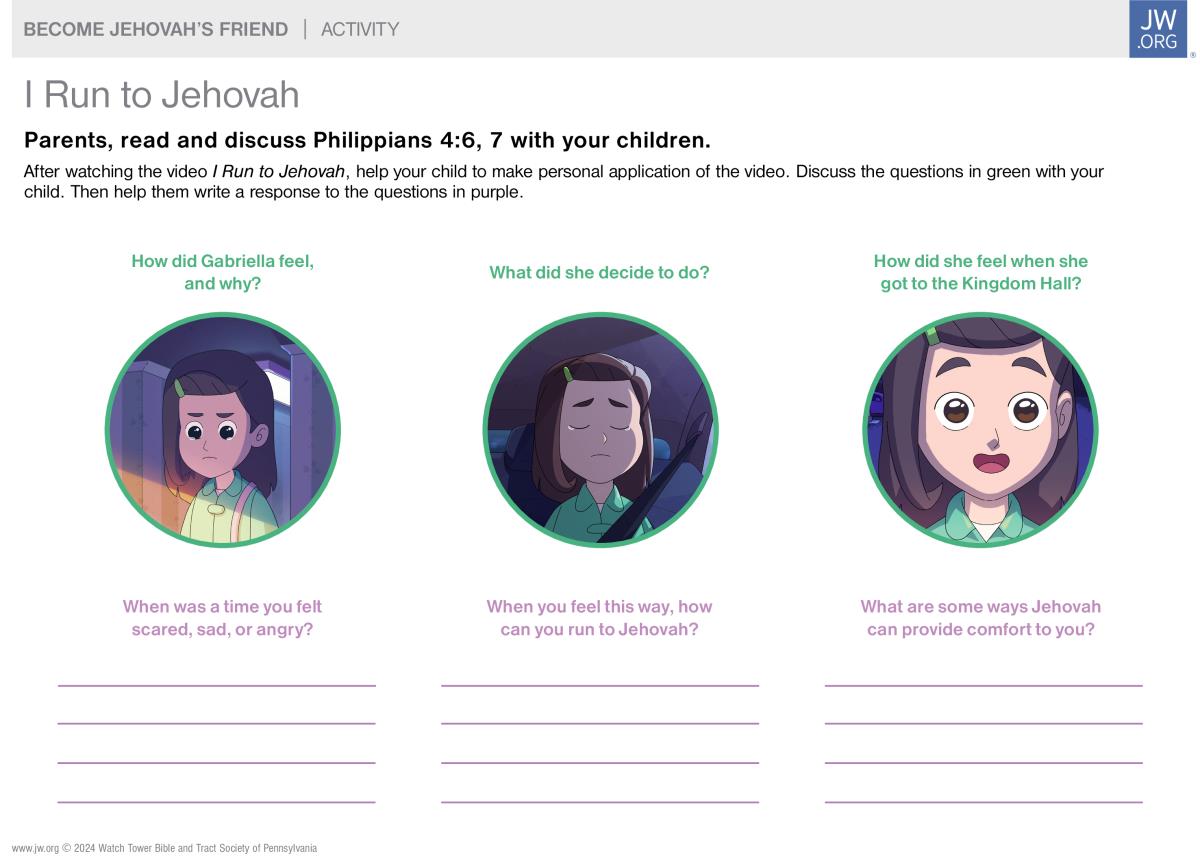 After watching the video I Run to Jehovah, help your child to make personal application of the video. Discuss the questions in green with your child. Then help them write a response to the questions in purple.