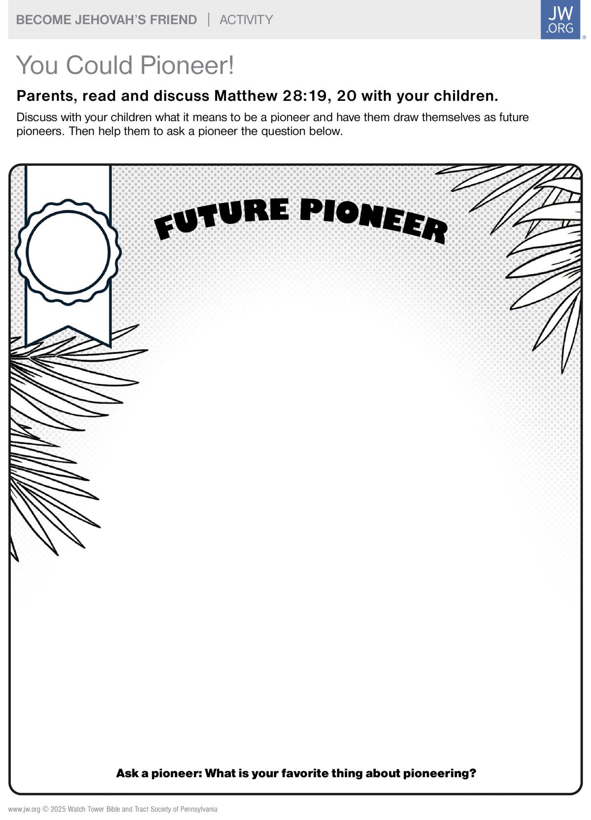 Discuss with your children what it means to be a pioneer and have them draw themselves as future pioneers. Then help them to ask a pioneer the question below.