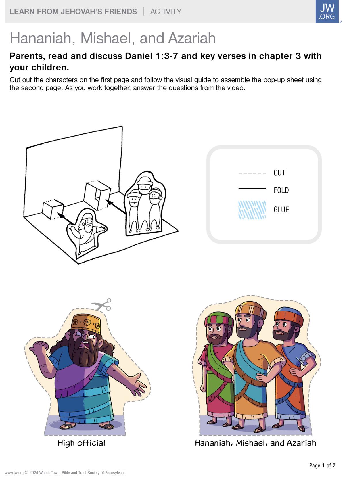 Use this printed activity to learn from Jehovah’s friends—Hananiah, Mishael, and Azariah.