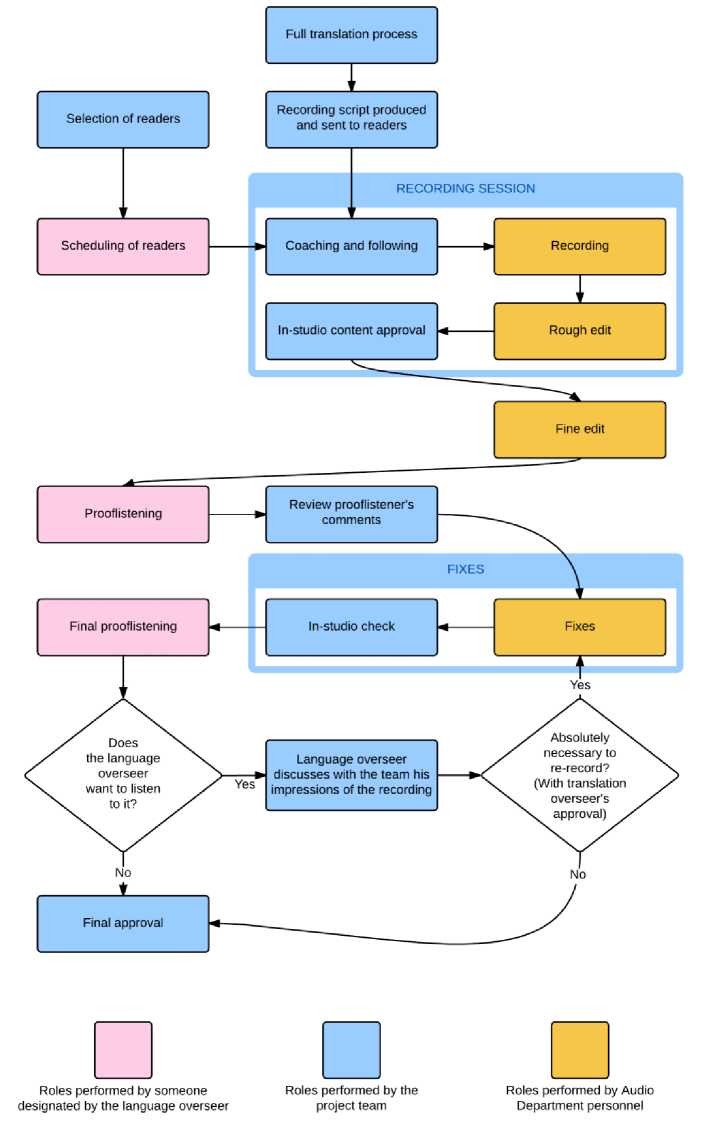 Note: The workflow for video publications does not involve a prooflistener. The whole team, together with the audio editor, will review and check the completed audio recording and, at a later stage, the master file.