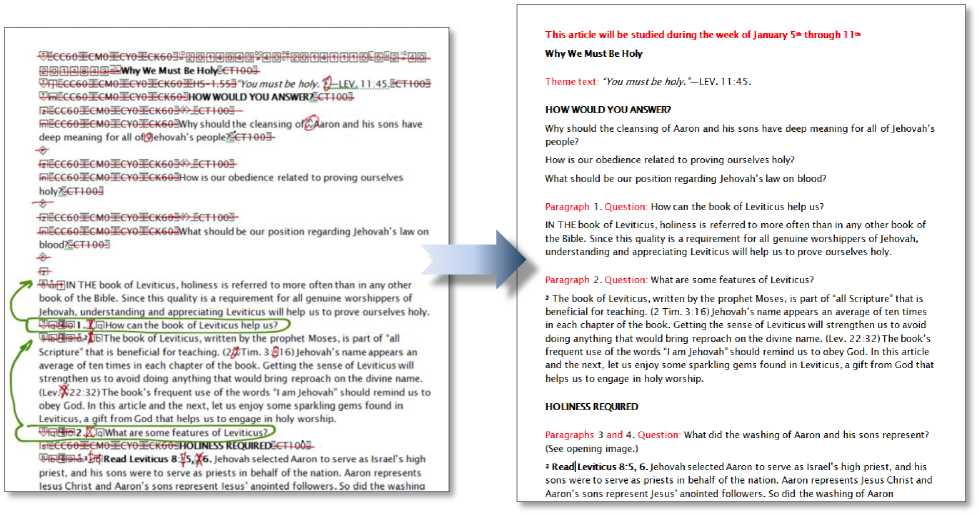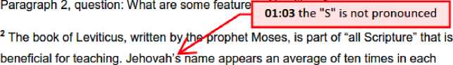 27. Before a translated publication can be recorded, the script that will be used for recording must be prepared and formatted for clear and easy reading. This may involve giving attention to font type and size, making sure that sentences do not break between pages, deleting markup characters that may distract the reader, and adding any additional wording that is needed to introduce the portions to be read. Study questions may need to be moved before the corresponding paragraph(s). Much of this work will be done automatically by WTS.