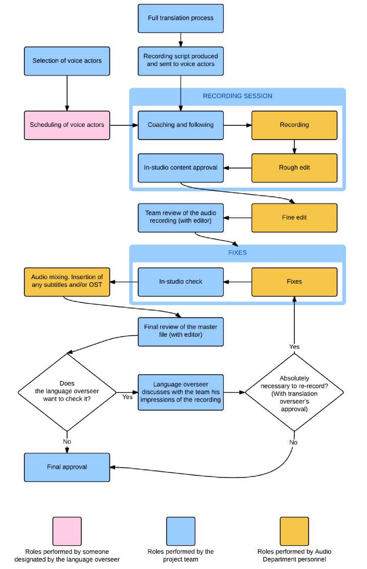 Note: In the case of videos, the prooflistening cycle described in paragraphs 55-60 is not needed, but the team and the audio editor will need to review and approve the recording before the audio track is mixed and any OST and subtitles are added (paragraphs 61-62). Before giving the final approval, the team will need to do a final review of the final master file together with the audio editor (paragraph 63).