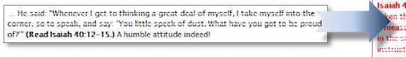 Naturalness in public reading requires effort. To achieve it, identify the principal ideas in the material that you are going to read, and observe how these are developed. Have this clearly in mind; otherwise, you will simply be reading words. Check the pronunciation of unfamiliar words. Practice reading aloud so as to get proper inflection and to group the words together in a way that conveys thoughts clearly. Do it again and again until your reading is fluent. Get to know the material well enough that when you read it aloud, your reading sounds like spirited conversation. That is naturalness. ... Whether you read the Bible or other materials, read portions that embody quotations in a way that makes the material live. If a number of characters are quoted, alter your voice somewhat for each one. A word of caution: Do not be overly dramatic, but do put life into the reading in a natural way.— be p. 130